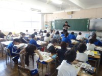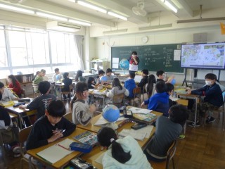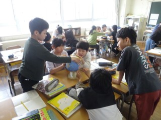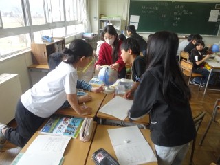 1限、5-1は社会「世界の中の日本」。ワールドツアーをしようと、東京から中国・北京、南アフリカ共和国までの距離を地球儀を使って測っていました。グループで協力し合いながら、楽しそうに学習に取り組んでいました。