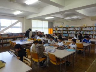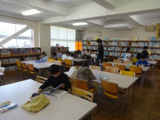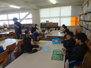 1限、5-1は図書館で読書でした。南魚沼市は、全学校に学校司書(図書館担当)が配置されています。本の整理、季節ごとのおすすめの本の紹介等、読書環境の充実に努めています。子どもたちは、お気に入りの本を探し、集中して本を読んでいました。城内小学校では、本は本袋に入れて机の脇にかけ、すぐに読書ができるようにしています。たくさん本を読んでほしいと思います。