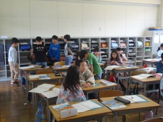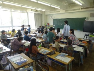 2年生のかけ算の問題は、数字が2つでしたが、3年生では数字が3つになり、より難しくなっています。すぐに立式するのではなく、教科書に出ている2人の考え方、①3×2=6 6×4=24 ②2×4=8 8×3=24の式の意味をみんなで考えました。①はだんごの数 ②はくしの数を表していることに気づいた子どもたちです。みんなで考えながら学習を進めている姿に感心しました。