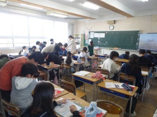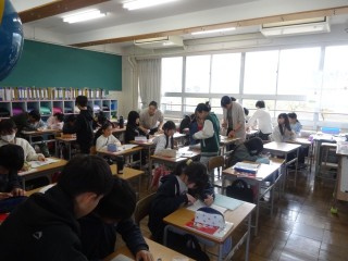 2限、6-1は算数「線対称」。◎(課題)は、「マス目がない場合は、どうかくか」でした。昨日は、マス目があり、マス目を頼りに線対称の図形をかきました。今日は、マス目がありません。長さ、角度を測るなど見通しをもった後、自分で線対称の図形をかきました。仲間で教え合いながら、みんなで課題を解決する姿が見られました。