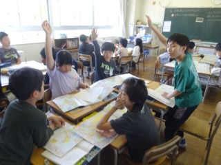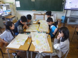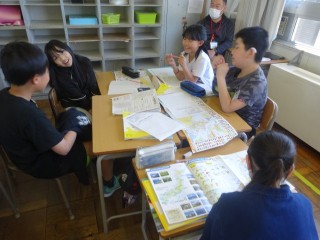 1限、5-1は社会「世界の中の日本の国土」。グループごとに分かれて、世界地図を見ながら、「日本のとなりの国は何でしょう?」など、クイズを出し合っていました。大変盛り上がって、意欲的に学習を進めていました。やる気にあふれている5年生です。