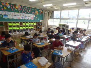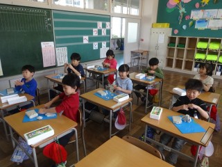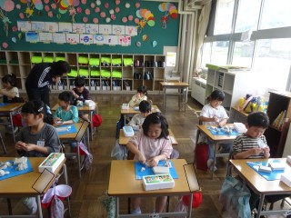 2限、1-1は図工。ねん土で好きな食べ物を作っていました。大変楽しそうで、細かいところまで丁寧に仕上げていました。途中、「これはブドウかな?」と質問すると、「正解」と反応する1年生。その後は、「これは何でしょう?」とクイズ大会になりました。ラーメン、ケーキ、パンなど自分の好きな食べ物を楽しそうに作っていました。楽しく学習している姿にうれしくなりました。