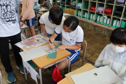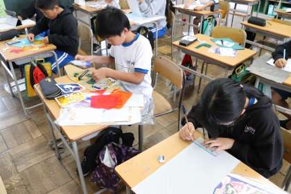 4限、6-2は図工「すてきな明かり」の学習。安全に気をつけてカッターを器用に動かしながら細かい部分まで画用紙を切り落としていました。
