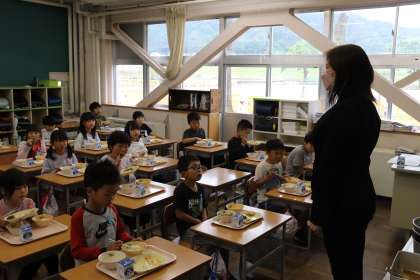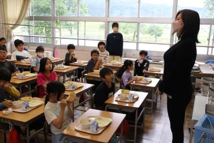 お昼の全校放送で自己紹介、各教室であいさつをしていただきました。