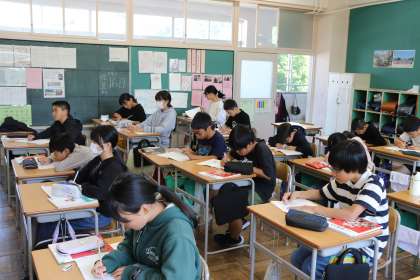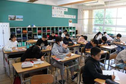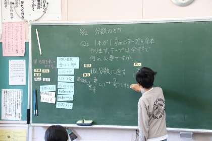 1限、6-2は算数「分数と整数のかけ算とわり算」の学習。「帯分数×整数の計算はどうやるのか」を追究課題に学習しました。数直線図や4マス関係図を使い、式がかけ算であることを確認しました。