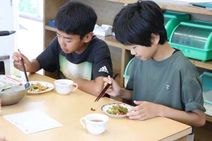 2限、6-1は家庭科の調理実習の続き。炒めて、塩・こしょうで味付けをして完成。