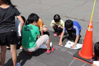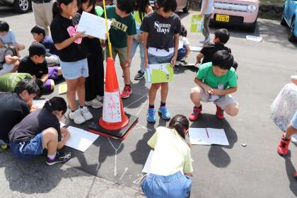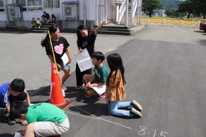 5限、3-1は理科「かげと太陽」の学習。「かげと太陽の位置をかくにんしよう」を追究課題に、かげと太陽の位置を方位磁針を使って確かめました。8時、11時、13時、14時のかげの記録をもとにメモしました。
