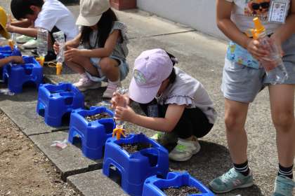 5限、1-1は生活科であさがおの種を植えました。昨日作っておいたふわふわの土のベッドにやさしく種を植えて、たっぷりと水をあげました。