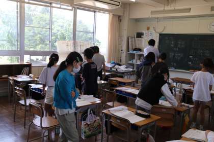 1限、5-2は算数「倍数と約数」の学習。「偶数+偶数は」を追究課題に学習しました。奇数+奇数は偶数になることを確かめた児童は、偶数+偶数の場合はどうなるのか考えました。意見交換の時間には、ノートに書いた自分の考えを多くの友だちに伝えていました。