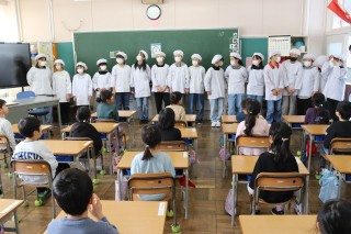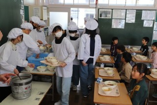 帽子、マスク、給食着の身支度をバッチリ整えた6年生がすばやく配膳しました。