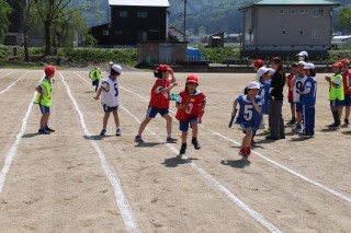 2限、3年生と4年生は合同体育で運動会のリレー練習をしました。