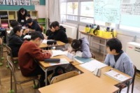 2限、4-1は総合、音楽学習発表会へ向けて太鼓演奏で着る法被のサイズ合わせをしま...