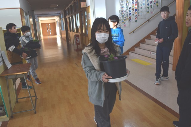 玄関に一人一鉢植えたパンジーを卒業式に咲かせるために、屋内へ移動しました。中学校校舎の2階で冬を過ごします。130鉢のパンジーを5,6年生が一つ一つ運んでくれました。適温の中ですくすく育ち、春を彩って...