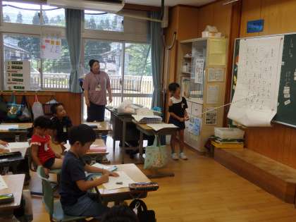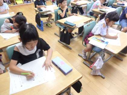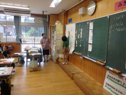 7/5 原稿用紙に 公開日 2024/07/05 更新日 2024/07/05 教育活動 1年1組の2時間目は国語の授業でした。教科書の「こんなことしたよ」の文を参考にして、自分の「こんなことしたよ」を作文します。初めて原稿用紙に書きます。まずは、「こんなことしたよ」の文を、前に出てきてみんなの前で読んだり、一マス空けるところや小さい「よ」などがどこにあるのか確認しました。ここでも、先生に指名された子を「いいなぁ」とうらやましがる意欲満々の子どもたちでした。 いいね(0)