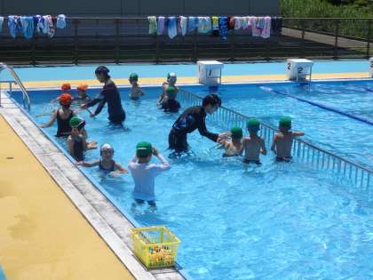 7/5 1,2年生プール授業1 公開日 2024/07/05 更新日 2024/07/05 教育活動 1,2年生は3,4時間目にプール授業を行いました。このグループはフラフープを歩いてくぐって水に顔をつける練習から始まり、「水中宝探しゲーム」をしたり、ビート板を使ってバタ足の練習をしたりしました。 いいね(0)