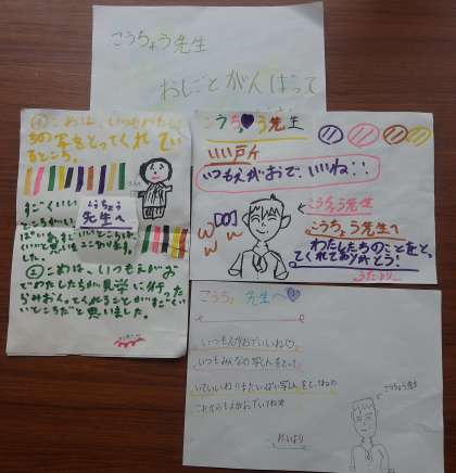 7/5 今日は3年生が 公開日 2024/07/05 更新日 2024/07/05 教育活動 昨日の記事で、5年生の子、4人が「校長先生のいいところ」を紙に書いて、渡してくれたことを載せましたが、今日は3年生の女の子3人が同じように「いいところ」を紙に書いて、校長室へ持って来てくれました。クレヨンを使って、似顔絵付きでした。ありがとう! いいね(0)