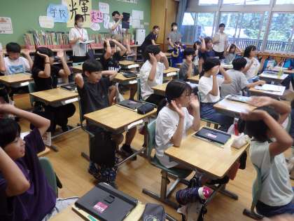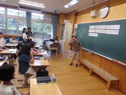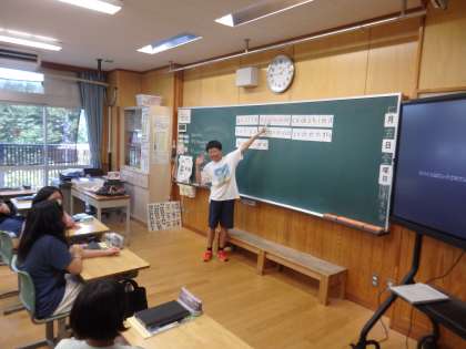 6年生の5時間目は国際科の授業でした。今日は市学習指導センターの指導主事や他校からの先生方への公開授業として行いました。しかし、子どもたちの笑顔と元気はいつも通りでした。これは授業開始5分前の様子です。アルファベットの「音読み」を身振りを付けながら行う活動を自分たちで進めていました。