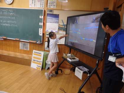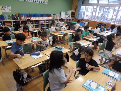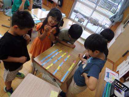 2年生の2時間目は算数の授業でした。「長さ」の学習です。「ジャンケンレース」で誰が一番長いテープを作ることができるか競いました。隣の人とペアでジャンケンをします。勝った子は、自分が何を出したかによって長さが違う3種類のテープをつなげていきます。「誰が一番長いテープを作れるか」を競いますが、「どうやったら長さを比べることができるか」を考える学習です。