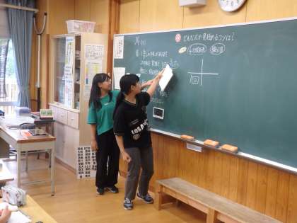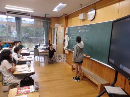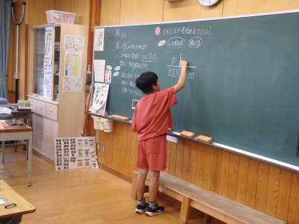 6年生の2時間目は算数の授業でした。分数の学習です。「1と4/5Lの牛乳があります。家族で1回に3/5Lずつ飲むと何回飲めますか。」という問題に取り組んでいました。これまでの問題は「1回分は何Lか」を求めるものでしたので、子どもたちから「個々で困っている」「ここまではできたけど、ここから先をどうすれば・・・」という困り感と、それに対する「こうすればいいんじゃないか」という発言がたくさん出ていました。
