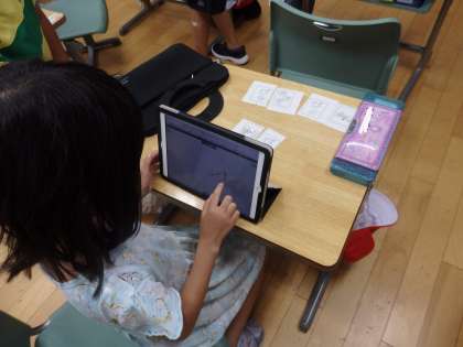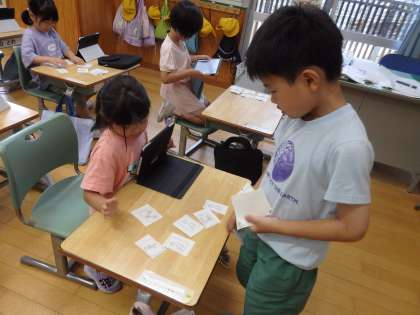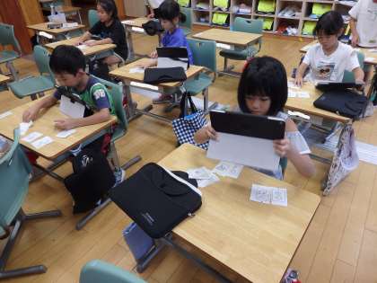 7/9 ペアを探そう 公開日 2024/07/09 更新日 2024/07/09 教育活動 1年2組の2時間目は国語の授業でした。絵カードと「びゃ」「びゅ」「びょ」などの小さい「や・ゆ・よ」を使っていることばのペアを見つけて、iPadで写真に撮っていました。例えば、「病院」の絵カードと「びょ」のカードを組み合わせます。いろいろなことばを見つけることができました。 いいね(0)