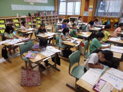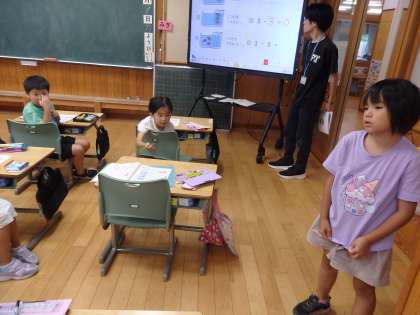 1年2組の4時間目は算数の授業でした。「水槽に金魚が3匹います。3匹とると残りは何匹ですか」や「1匹もとれないと、残りは何匹ですか」などの式や答えに0が出てくる問題に取り組んでいました。