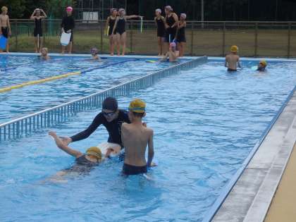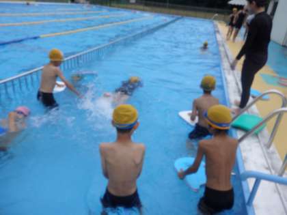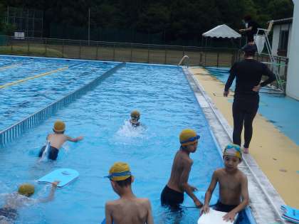 7/9 5,6年生水泳授業1 公開日 2024/07/09 更新日 2024/07/09 教育活動 5,6年生の5,6時間目は水泳授業でした。5時間目が始まる頃に雨が降ってきましたが、体育館で体操を終えた頃にはあがっったので予定通り実施しました。このグループはビート板を使ってけのびの練習をしたり、バタ足で25m泳ぐ練習をしました。 いいね(0)