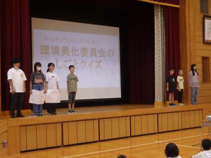 7/11 委員会の仕事クイズ 公開日 2024/07/11 更新日 2024/07/11 教育活動 今日は児童朝会を行いました。環境美化委員会が「環境美か委員会のお仕事クイズ」を出題しました。水槽の水替えについてや餌やりのタイミング、赤い羽根や緑の羽根募金の時期や使い道についてクイズにして出題してくれました。 いいね(0)