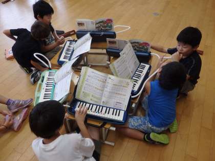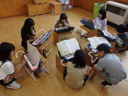 3年生の2時間目は音楽の授業でした。「ゆかいな木琴」という曲を鍵盤ハーモニカで演奏する練習をしていました。グループごとで輪になって練習をしていました。