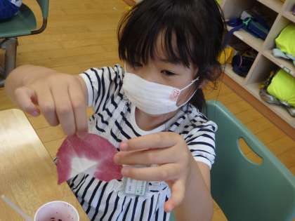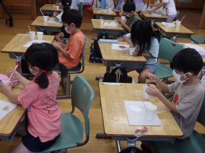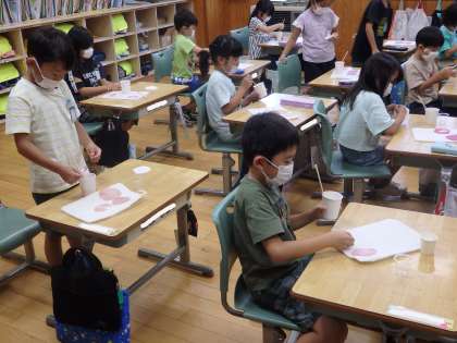 7/16 アサガオを作る 公開日 2024/07/16 更新日 2024/07/16 教育活動 1年1組の2時間目は生活の授業でした。先週、アサガオの花を摘んで作った色水を使ってアサガオを作りました。紙コップに入れた色水に3回折った丸い紙を浸します。紙を開くときれいなアサガオの花のできあがりです。うれしくて、花を4個も作った子がいました。 いいね(0)