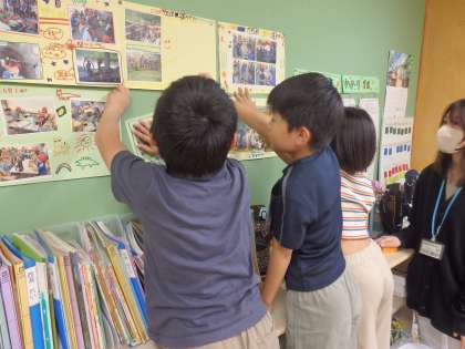 3年生の3時間目は学活の授業でした。係ごとに活動を行っていました。ジェスチャークイズを考える係、掲示物をつくって貼っている係、図書室でクイズのネタを考える係、ショートコントの小道具を作っている係など、係ごとで協力しながら、楽しそうに活動していました。