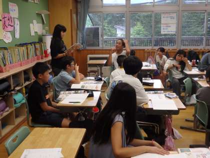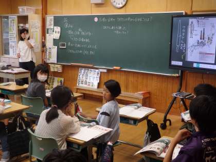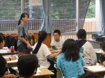6年生の5時間目は社会の授業でした。古墳の分布やワカタケル大王の剣が出土した地域が描かれた地図を読み取り、そこから分かることを班で話し合いました。「関西に大きな古墳がある」「東北〜九州にかけて分布している」ということや「剣を置いていったのは、自分の強さをアピールしたのではないか」「剣が出土した熊本、埼玉とは親交があったのではないか」といった資料を読み取った上での自分の考えを発表していました。