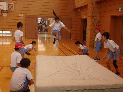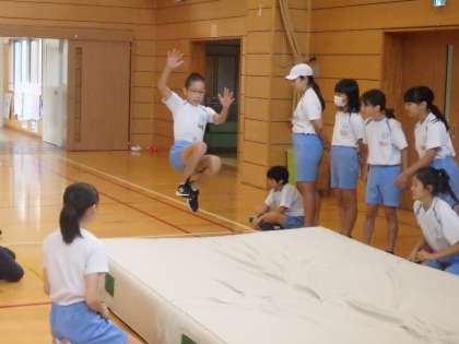 5,6年生の1時間目は体育の授業でした。6年生は幅跳びをしていました。体育館にエバーマットを敷いて行いましたが、1回1回記録も測りました。いいフォームで跳んでいる子が何人もいました。