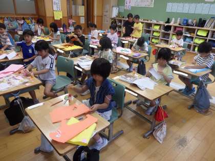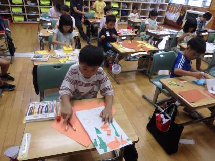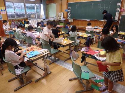 7/17 折って立てたら 公開日 2024/07/17 更新日 2024/07/17 教育活動 1年2組の5時間目は図工の授業でした。「折って立てたら」という工作の続きでした。色画用紙を好きな形に切って、クーピーで絵を描いたり貼り合わせたりして、立体的な模型を作りました。動物や恐竜、家などを作っていました。 いいね(0)
