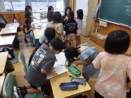 7/18 着々と準備 公開日 2024/07/18 更新日 2024/07/18 教育活動 3年生の3時間目は学活の授業でした。来週行うお楽しみ会の準備が進んでいます。司会や遊びの説明をする子達は原稿ができあがったので、本番どおりに立って読む練習です。飾りづくりの子やプログラム作りの子もできあがってきました。来週が楽しみですね。 いいね(0)