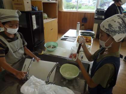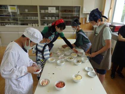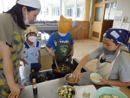 にじいろ学級の子どもたちは1,2時間目に調理実習を行いました。畑で自分たちが育てた野菜を炒めたり、ピザを作ったりしました。炒める手つきがとても慣れている子がいました。