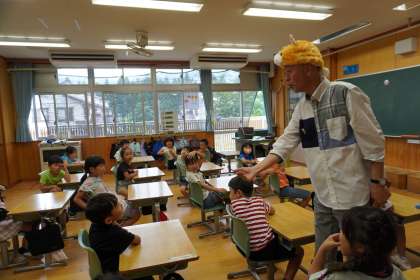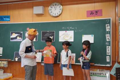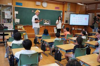 7/19 1年1組 英語に親しむ 公開日 2024/07/19 更新日 2024/07/19 国際科 1年1組の3時間目は国際科の授業でした。英語の紙芝居の上演や絵本の読み聞かせなどを行っているPO「アトリエさかい」の方を講師としてお招きして授業を行いました。まずは英語で歌いながら講師の先生が英語で自己紹介。その後、子どもたちと英語でやり取りをしながら、絵本の読み聞かせをしていただきました。最後は絵本のキャラクターの絵を描いて、みんなに紹介しました。 いいね(0)
