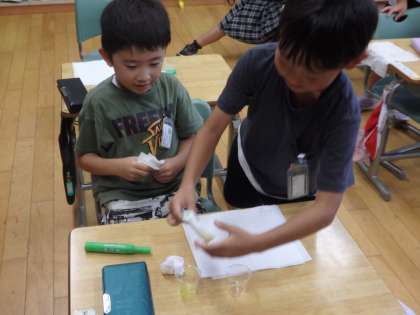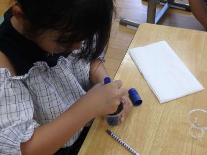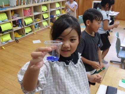 7/22 今日はポスカで 公開日 2024/07/22 更新日 2024/07/22 教育活動 1年1組の3時間目は生活の授業でした。前の時間にはヒマワリの花から作った色水でキッチンペーパーに模様を描きましたが、今日はポスカで行いました。プラスチックコップの底に好きな色のポスカを塗って水を入れると、きれいな色水の完成です。黄色や緑、オレンジ色などたくさんの種類の色水ができました。お互いの色水を使わせてあげたりしながら、模様づくりを楽しみました。 いいね(0)