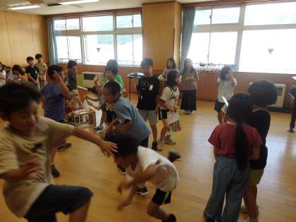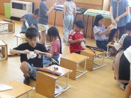 3年生の3時間目は音楽の授業でした。1学期の授業で使用してきた鍵盤ハーモニカと地コーダーの掃除をしていました。水洗いをしたり、ガーゼで内部を拭いたりしました。「夏休み中、リコーダーは持ち帰ります。」と聞いて、「家の人に演奏してあげるんだ。」と教えてくれた子がいました。その後、先生が1学期に学習した「ハッピーソング」という曲のCDを流すと、自然に思い思いに体を動かしながら歌い出す子どもたちでした。