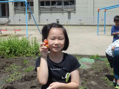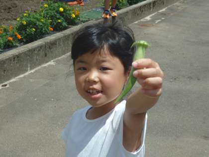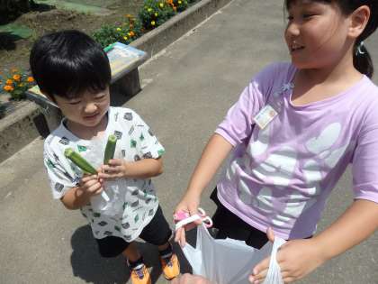 収穫した野菜をうれしそうに見せてくれました。ビニール袋いっぱいにミニトマトが採れた子がいました。前回はまだ小さくて収穫できなかったオクラも大きく成長して収穫できました。「昨日も来て、野菜取ったんだよ。」と教えてくれた子がいました。