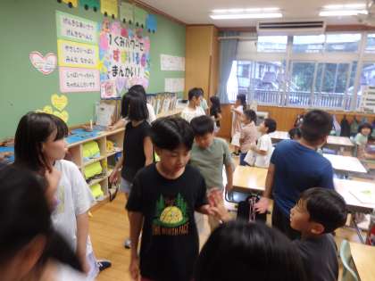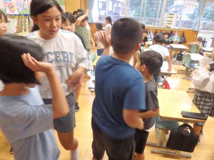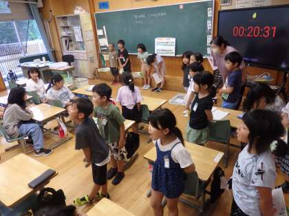 1年1組の音読発表会が終わって、1年生から「ありがとうございました!」とお礼のあいさつ。5年生は教室を出るときに「よく頑張ったね!」と言わんばかりに1年生とハイタッチ!