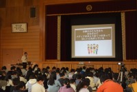 朝会とリハーサル終了後、4年生はそのまま体育館に残り、担任の先生が動画撮影したリハでの4年生の発表をみんなに見せました。視聴した後に再度、練習を行いました。