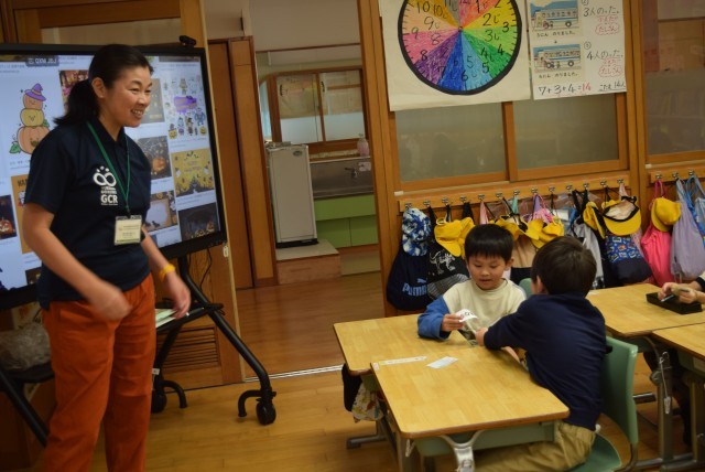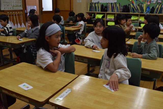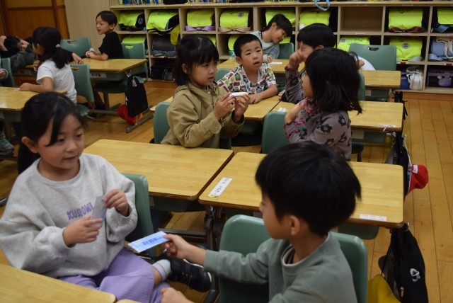 次は、ペアになり隣の友達とあいさつを交わして、名前と好きな色を話し名刺を渡します。