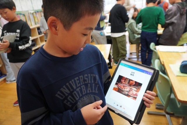 5年生は、社会科の学習を生かして、自分が選んだ日本の都道府県の特徴をタブレットを使って留学生に英語で説明しました。