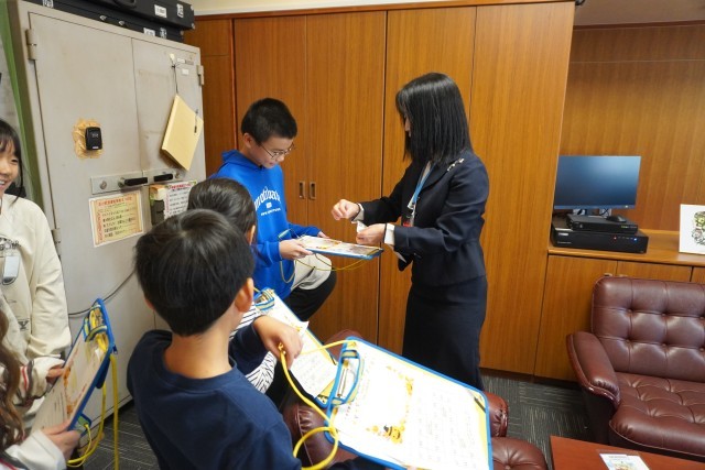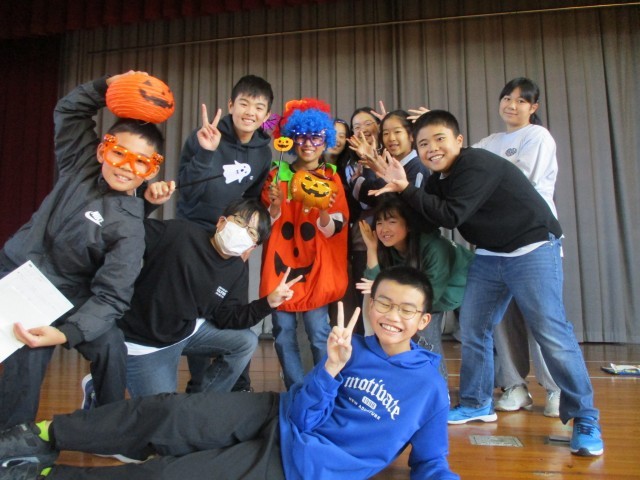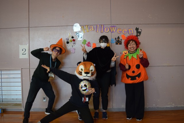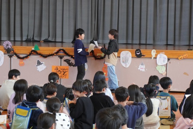 五十沢小学校では、国際科の学習でハロウィンパーティーを全校縦割り班活動として行います。各教室でミッションを用意した教職員と英語で言葉を交わし合い、ミッションをクリアしたりシールをもらったりする活動です。児童会のわくわく委員会が中心となり、全体で会話の練習をし、班ごとにスタート。ボールゲームやなぞなぞ、英語クイズなど、各教室のミッションをクリアしてスタンプやシールをもらいました。最後は、班ごとに仮装して記念写真をとりました。