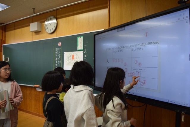 4年生は、物語文「ごんぎつね」のごんがうたれた場面の読み取りをしました。これまでも、選択型で追求する授業を行ってきました。今回も「ごんはうれしい気持ちだったのか悲しい気持ちだったのか」を選択しその理由を交流し合いました。3年理科と同様に、「うれしい」と「悲しい」の考えに「自信あり」「たぶんそう」「自信ない」のどこに自分が位置するかを電子黒板上に表し、自分の考えを確かにするために交流をしました。表から、自分と似た考えを持っていそうだと思う友達のところに行きどのような理由だったのか確かめて自分の考えを強める児童や、自信がないけれど友達の理由で自分の言いたかったことをはっきりさせる児童、理由を聞いたら考えが変わった児童など、進んで交流する姿が見られました。最後には、自分の考えが広がったこと深まったことに気づき、振り返りを書いていました。
