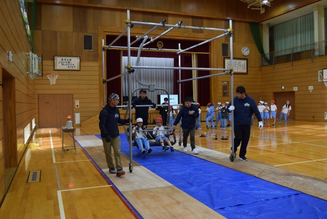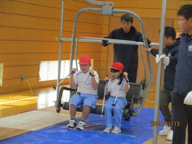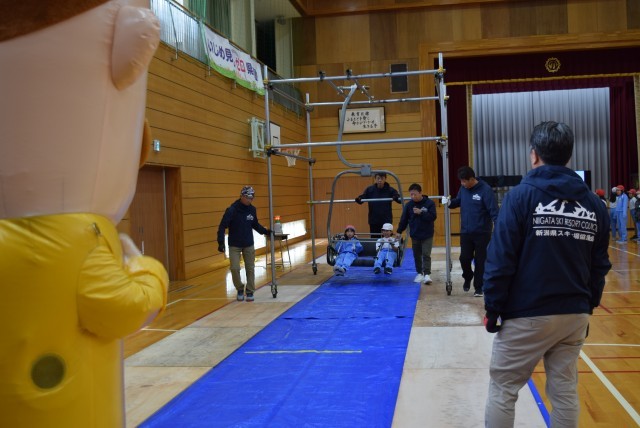 南魚沼市スキー協議会の方々から「リフト体験」をしませんか、とお誘いを受けました。どうやって体験するのだろうと思っていると、屈強な会員の方が、あっという間に単管パイプを組み立てて、本物のリフトをぶら下げて、車輪で転がして移動させるリフトを作ってくださいました。「乗ってもいいよ」という青ランプがついたら進んで、ストックを挙げて待ち、慌てずゆっくり座るという一連の流れを全員が体験しました。
