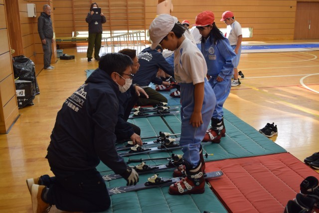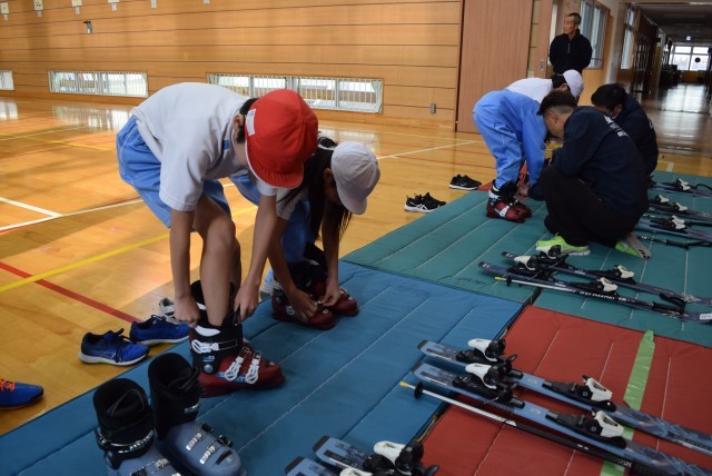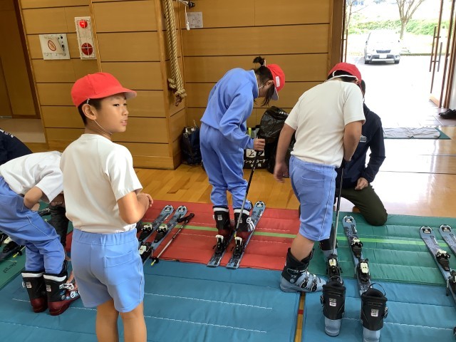 4年生の人数分のアルペンスキーの靴と板、ストックを用意して履く練習もしてくださいました。