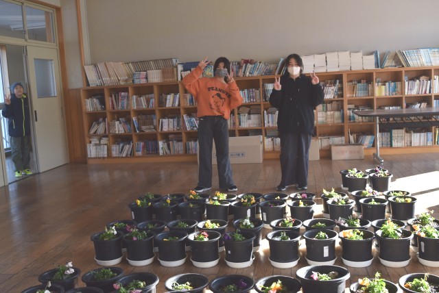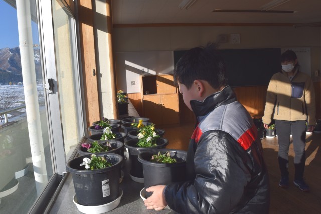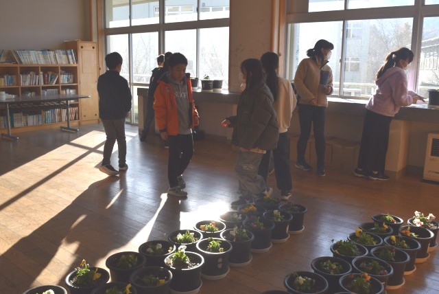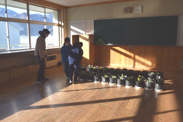 玄関に一人一鉢植えたパンジーを卒業式に咲かせるために、屋内へ移動しました。中学校校舎の2階で冬を過ごします。130鉢のパンジーを5,6年生が一つ一つ運んでくれました。