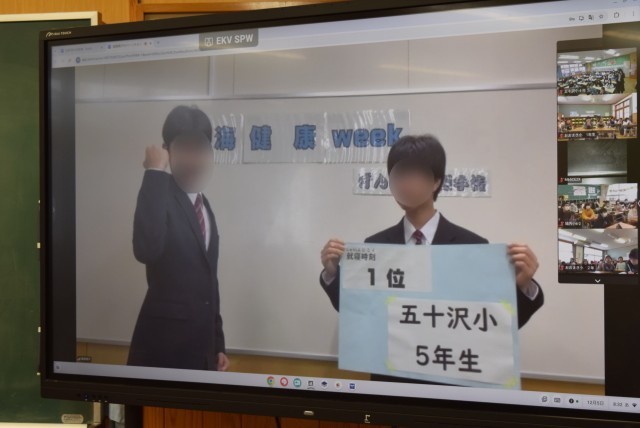 1位をとった学級の代表が、オンラインの画面越しに受賞のコメントを話しました。今回は、五十沢小学校の5年生が「睡眠」の項目で、1位となりました。この期間はどの児童生徒も意識して生活したと思いますが、その中でも1位ということは、一人一人が目標達成しようと本気で取り組まなければ、できないことだと思います。全員の力で達成できたことに、校内だけでなく、オンラインで他校からも大きな拍手が送られました。