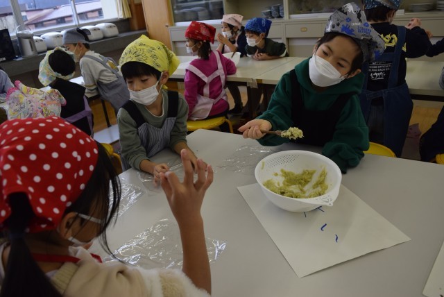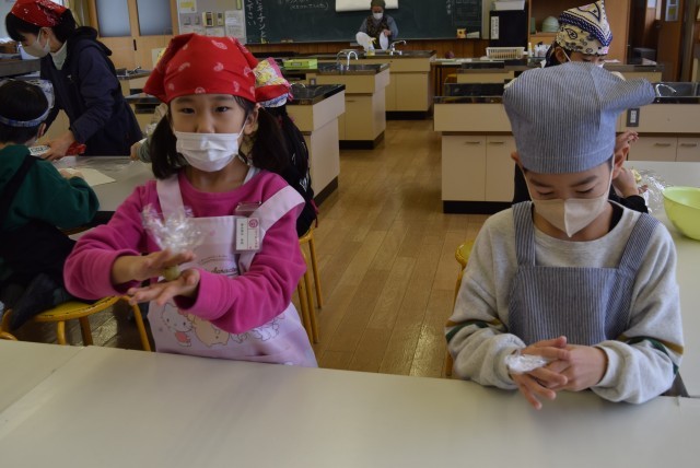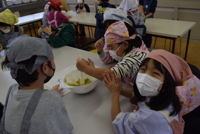 1年生が生活科で育てたサツマイモは、収穫からしばらくおいたので、十分甘みが増しました。今日は、サツマイモの料理です。